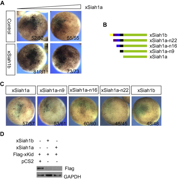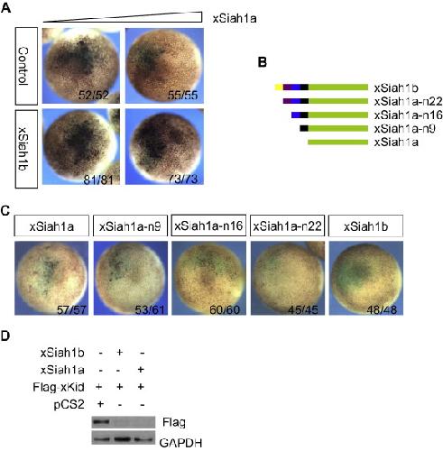 Analysis of xSiah1b function. (A) Co-injection of xSiah1a and xSiah1b. Two nanograms of xSiah1b mRNA was co-injected with 100 and 200 pg xSiah1a mRNA, respectively. (B) Diagram of the constructs of xSiah1b with different additional N-terminal truncations. (C) Injection of 50 pg of mRNA. (D) Western blot analysis of xKid expression to detect xSiah1a and xSiah1a activity in 293T cells. Equivalent amounts of xSiah1a, xSiah1b and pCS2 (250 ng), were co-transfected with Flag-xKid (1 μg).