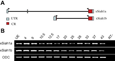 Temporal expression of xSiah1a and xSiah1b during Xenopus laevis embryogenesis. (A) Schematic diagram of xSiah1a and xSiah1b in the genome. Positions of the primers in the Siah1 gene used for RT-PCR are indicated by arrows. UTR, untranslated region; CR, coding region. (B) RT-PCR analysis of xSiah1a and xSiah1b during Xenopus laevis embryogenesis. UE, unfertilized eggs, RT−, negative control, ODC, ornithine decarboxylase as a loading control.