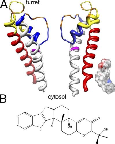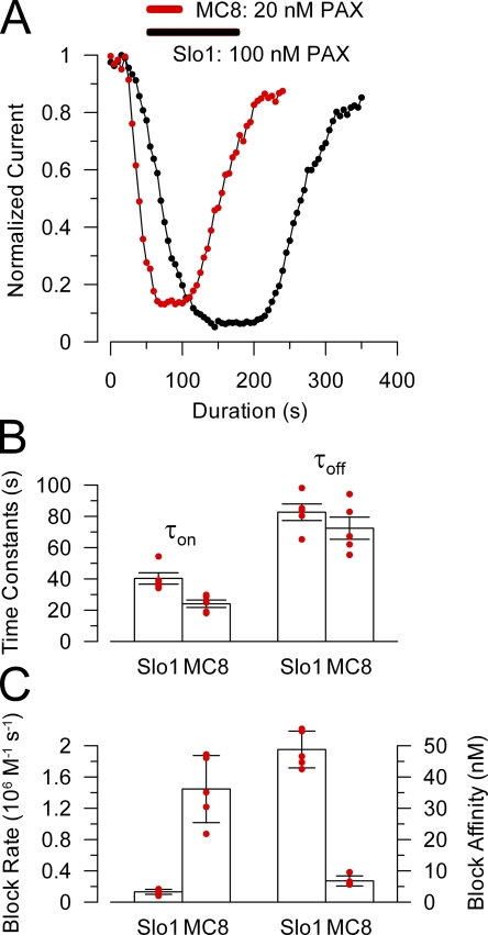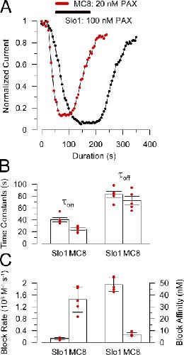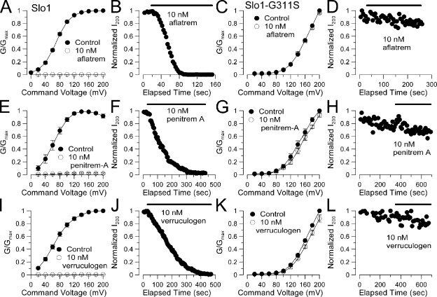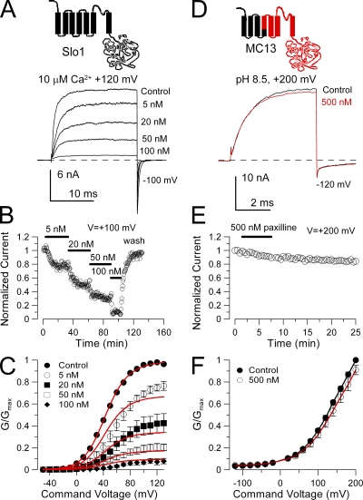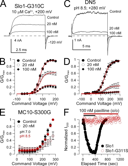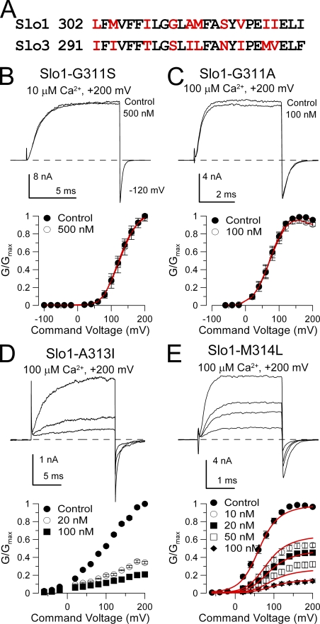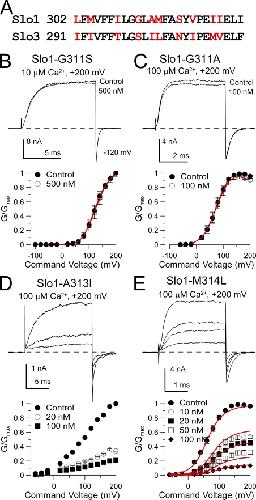 The tremorogenic fungal metabolite, paxilline, is widely used as a potent and relatively specific blocker of Ca(2+)- and voltage-activated Slo1 (or BK) K(+) channels. The pH-regulated Slo3 K(+) channel, a Slo1 homologue, is resistant to blockade by paxilline. Taking advantage of the marked differences in paxilline sensitivity and the homology between subunits, we have examined the paxilline sensitivity of a set of chimeric Slo1/Slo3 subunits. Paxilline sensitivity is associated with elements of the S5-P loop-S6 module of the Slo1 channel. Replacement of the Slo1 S5 segment or the second half of the P loop results in modest changes in paxilline sensitivity. Replacing the Slo1 S6 segment with the Slo3 sequence abolishes paxilline sensitivity. An increase in paxilline affinity and changes in block kinetics also result from replacing the first part of the Slo1 P loop, the so-called turret, with Slo3 sequence. The Slo1 and Slo3 S6 segments differ at 10 residues. Slo1-G311S was found to markedly reduce paxilline block. In constructs with a Slo3 S6 segment, S300G restored paxilline block, but most effectively when paired with a Slo1 P loop. Other S6 residues differing between Slo1 and Slo3 had little influence on paxilline block. The involvement of Slo1 G311 in paxilline sensitivity suggests that paxilline may occupy a position within the central cavity or access its blocking position through the central cavity. To explain the differences in paxilline sensitivity between Slo1 and Slo3, we propose that the G311/S300 position in Slo1 and Slo3 underlies a structural difference between subunits in the bend of S6, which influences the occupancy by paxilline.