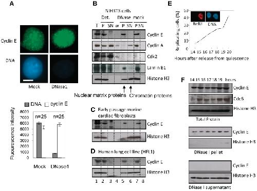 Figure 1. Cyclin E is present in nuclear matrix-associated foci. (A) Immunofluorescent detection of cyclin E (green) and DNA (blue) in cycling NIH3T3 cells after extraction with or without DNase. Bar is 5 μm. Histogram shows average fluorescence intensity derived from multiple images with SEM. (B) Western blot showing cyclin E and other proteins as indicated, in fractions generated by serial extraction of NIH3T3 cells. T = total protein. Cells were lysed in detergent containing buffer to generate pellet (P) and supernatant (SN). Pellet was washed with 0.5 M NaCl to generate ‘w’ and extracted with or without DNase. All fractions are derived from cell equivalents. (C and D) As in B, showing cyclin E in early passage murine cardiac fibroblasts and human lung cell line HFL1, respectively. (E) The proportion of NIH3T3 cells engaged in DNA synthesis between 14 and 19 h after release from quiescence, measured by incorporation of BrdU. Inset shows BrdU (red) in nuclei (blue) at 19 h. (F) Western blots showing total cyclin E, CDC6 and histone H3 14–19 h after release from quiescence (upper panel). After extraction with DNase cyclin E remained in the pellet (middle panel), despite complete release of histone H3 (lower panel), at all time points.