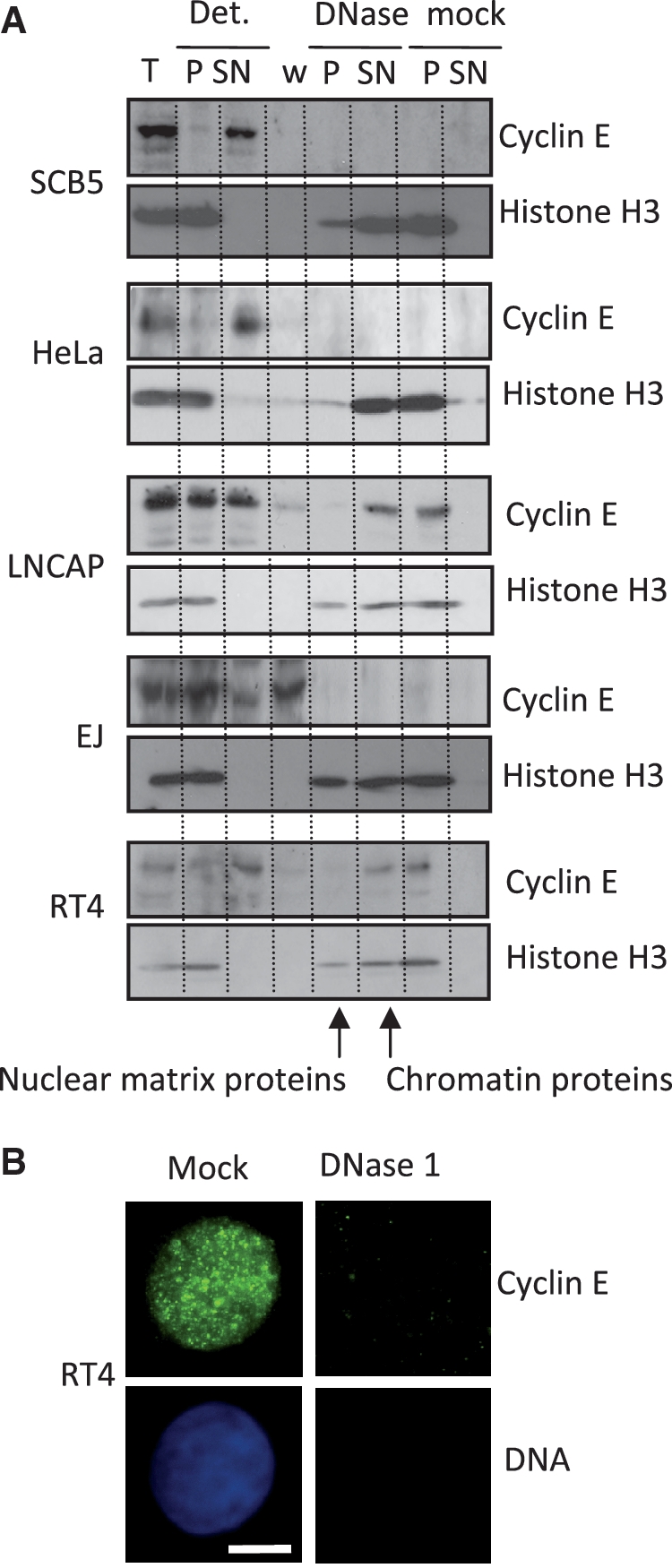 Figure 2. Cyclin E is not immobilized on the nuclear matrix in cancer cells. (A) Western blot showing absence of cyclin E from the DNase resistant fraction in representative cancer cell lines fractionated by the procedure used in Figure 1. (B) Immunofluorescence images of RT4 cells showing cyclin E (green) and DNA (blue). Cyclin E occupies a focal pattern in mock treated cells, but is fully extracted by DNase. Bar is 5 μm.