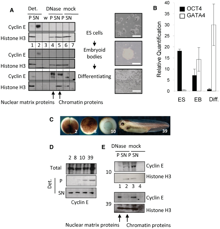 Figure 3. Cyclin E is recruited to the nuclear matrix during embryonic stem cell differentiation and Xenopus laevis development. (A) Western blot showing protein fractions derived from murine ES cells before and after embryoid body formation, and after 25 days in culture under differentiation conditions. Images show cell populations before extraction. Bar = 50 μm. Cyclin E changes from detergent soluble in ES cells and embryoid bodies to mostly DNase resistant in differentiated cells despite efficient extraction of histone H3. (B) Quantitative RT–PCR of differentiation markers Oct4 and GATA4 in cells in A, with SEM. (C) Xenopus embryos at stages 2, 8, 10 and 39. (D) Western blots showing total cyclin E and the proportion that is detergent-resistant (P) and detergent soluble (SN) at each stage. (E) Western blot showing detergent-resistant cyclin E after further incubation without (mock) or with DNase. Histone H3 was used to control for chromatin digestion. By stage 39 the detergent resistant fraction of cyclin E is DNase resistant.