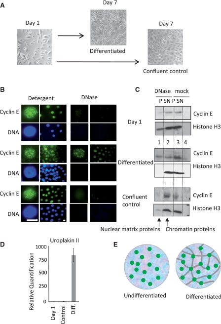 Figure 4. Recruitment of cyclin E to the nuclear matrix during differentiation of NHU cells (A) Cycling NHU cells were grown to confluence without differentiation or induced to differentiate over 7 days. (B) Cyclin E (green) and DNA (blue) in nuclei from cycling cells (Day 1, upper panels), differentiated (Day 7, middle panels) and confluent control cells (Day 7, lower panels), after extraction with detergent or DNase as indicated. Bar is 10 μm. (C) Detergent and DNase extracted protein fractions from the populations shown in A. Cyclin E changes from DNase sensitive in undifferentiated NHU and confluent control cells to partly DNase resistant in differentiated NHU cells, despite efficient extraction of histone H3. (D) Quantitative RT-PCR showing uroplakin 2 expression with SEM. (E) Model of cyclin E foci (green) associated with chromatin (blue background), unconstrained by attachment to the nuclear matrix (gray lines) in undifferentiated cells, but mounted upon a nuclear matrix in differentiated cells.