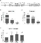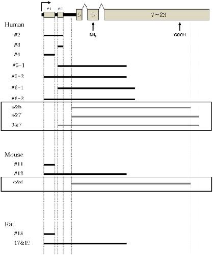 Figure 3. Strategy for cloning GABAB1k.The top figure represents exon-intron composition of the proposed GABAB1k. Numbered rectangular boxes represent known exons, and lines between boxes are introns. Two arrows on the bottom of the boxes represent ORF. Black bar is intron 4, and the two probe sequence data, NCBI accession numbers W07715 and N80593, are indicated as #1 and #2 above small rectangular boxes, respectively. They are 5′ and 3′ sequences of the microarray probe, clone 300899. A arrow above the black bar is a possible transcription initiation site. Horizontal lines indicate sequences detected after PCR. Based on microarray probe, clone 300899, the following clones were detected in human cultured cells, mouse midbrain, and rat hippocampus: #2, #3, #4, #11, and #18. From the previous microarray probe sequence analysis, the microarray probe aligned to intron 4 and was either 3′ or 5′ UTR of novel isoforms. Because there was no known human GABAB1 isoform that had intron 4 as an exon, the two possible isoform models, GABAB1j and GABAB1k, were proposed. The predicted GABAB1j and GAGAG1k contain intron 4 as 3′ or 5′ UTR, respectively. Because GABAB1j and GABAB1k are only two possible isoform models that contain clone 300899, #2, #3, #4, #11, and #18 can be partial GABAB1j or GABAB1k and show their existences. From the same RNA sources six different N-terminal partial clones, #5-1, #5-2, #6-1, #6-2, #12, and 17&19, indicated the existence of GABAB1k. They share common 5′ UTRs and partial N-terminal ORFs of GABAB1k and suggest that GABAB1k exists in human, mouse, and rat. To clone the full ORF of GABAB1k, additional primers were designed at its possible 3′ UTR region based on other known isoform sequence analyses. Full ORF containing clones were cloned from human brain and mouse midbrain. Bottom two boxes show clones which contain the full ORF (a&b, a&7, 3&7 in human and c&d in mouse). |