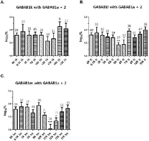 Figure 6. The functional effects of three novel human isoforms, GABAB1k, l, and m.Inhibitory effects were measured in Xenopus oocytes 5 days after injecting GABAB1a, GABAB2 cDNA and GIRK1, GIRK2 cRNA along with GABAB1k, l, or m cDNA. For vector controls, vectors were injected in the same amounts as used for the isoforms. Isoform and vector injection amounts varied from 0 to 15 times of GABAB1a injection amount. Used GABA concentration was 3 mM, an approximate maximum response concentration. For each batch, individual GIRK currents from isoform injected oocytes were normalized to percentage by the average vector control current. For nonparametric tests, the individual percent values were changed to log10. After one-way ANOVA and Dunnett's tests, one-tailed unpaired Student's t-tests were performed between no isoform injected groups and the isoform injected groups. A. GABAB1k had no inhibitory effect. B. GABAB1l data showed significant differences by ANOVA and Dunnett's tests (p = 0.0058), and caused significantly decreased GIRK currents at 5× and 6× GABAB1l (**p = 0.0014 and *p = 0.0229, respectively). C. ANOVA and Dunnett's tests showed the significant differences of GABAB1m data (p = 0.0040). GABAB1m showed significant decreases at 11× and 12× GABAB1m (***p = 0.0003 and **p = 0.0064, respectively). The numbers of recorded oocytes are shown above the bars by each group. Data are expressed as the mean ± SEM. |