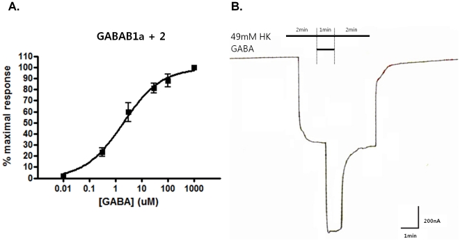 Figure 5. GABAB1a/2 concentration response curve.A. cDNA and cRNA double injections were performed. For cDNAs, both GABAB1a and GABAB2 were injected into the nucleus of Xenopus oocytes. GIRK1 and GIRK2 cRNAs were also injected into the cytosol of the same oocytes. Current response of GABAB receptor and GIRK expressing oocytes were measured by two-electrode voltage clamp. 1 mM GABA was the maximum response concentration; EC50 was 1.9 uM; Hill slope was 0.59. B. For GABAB1a/2 concentration response curve measurement, GABA dissolved in 49 mM HK was applied for 1 min following a 2 min 49 mM HK application. After 2 additional min of 49 mM HK application, a 20 min wash with ND96 was followed. |