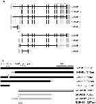 Figure 1. Schematic summary of GABAB1 isoforms.A. Introns and exons of known and novel GABAB1 isoforms were compared. The numbers listed at the top are exon numbers of GABAB1a. Blocks represent exons, and lines are introns of the GABAB1 gene. Black lines and blocks are ORFs, and grey lines and blocks are UTRs. Double line is cDNA microarray probe, clone 300899, which aligns to the intron 4 of GABAB1a. Human GABAB1a, b, c, e, and rat GABAB1j are previously identified isoforms. After cloning, the following novel isoforms were found in human: GABAB1k, GABAB1l, GABAB1m, and GABAB1n. Human GABAB1j was predicted. Mouse GABAB1j and GABAB1k were also cloned. GABAB1k contains the 3′ part of intron 4 through exon 23. GABAB1l has additional splicing out of exon 15, and GABAB1m has similar splicing patterns as GABAB1l except for additional splicing out at 5′ part of exon 6. GABAB1n has an SNP on exon 8. B. ORFs of GABAB1 isoforms are shown with important functional domains. Black bars are previously known isoforms, and grey bars represent novel isoforms. Dotted lines stand for unique sequence of each isoform. GABAB1k contains GABA binding sites, seven transmembrane domains, a G-protein coupling region, and a C-terminal intracellular region. GABAB1l and GABAB1m do not have transmembrane domains, a G-protein coupling region, or C-terminal intracellular regions (same as GABAB1e). GABAB1m has a longer N-terminal than GABAB1l. GABAB1n contains only a partial GABA binding site. |