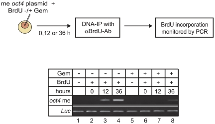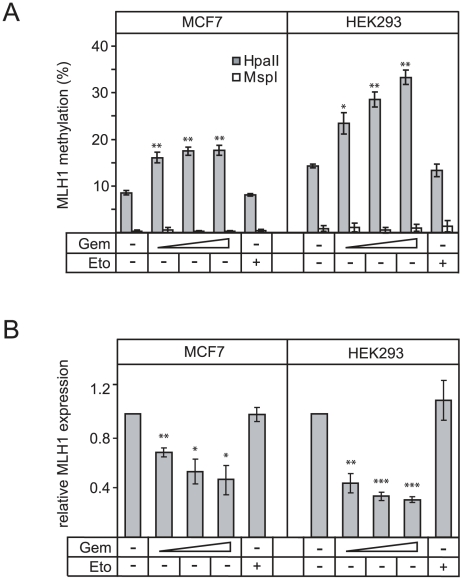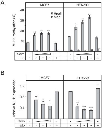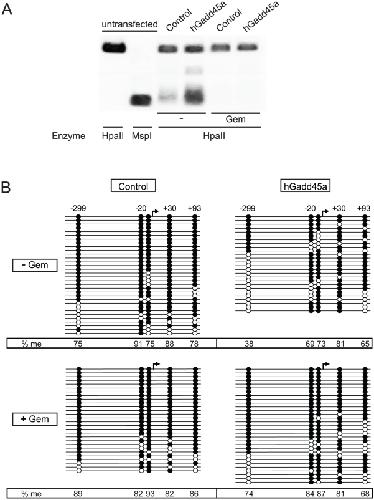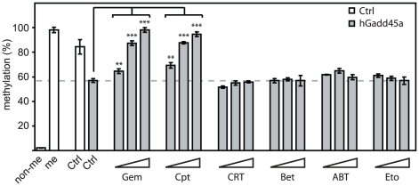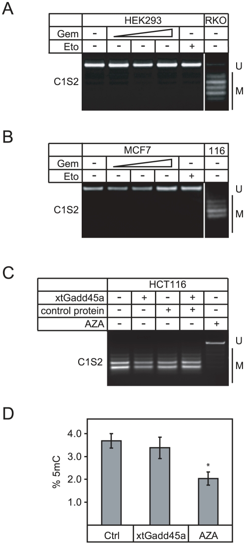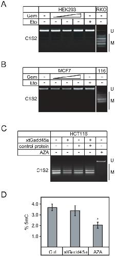 Gemcitabine is a cytotoxic cytidine analog, which is widely used in anti-cancer therapy. One mechanism by which gemcitabine acts is by inhibiting nucleotide excision repair (NER). Recently NER was implicated in Gadd45 mediated DNA demethylation and epigenetic gene activation. Here we analyzed the effect of gemcitabine on DNA demethylation. We find that gemcitabine inhibits specifically Gadd45a mediated reporter gene activation and DNA demethylation, similar to the topoisomerase I inhibitor camptothecin, which also inhibits NER. In contrast, base excision repair inhibitors had no effect on DNA demethylation. In Xenopus oocytes, gemcitabine inhibits DNA repair synthesis accompanying demethylation of oct4. In mammalian cells, gemcitabine induces DNA hypermethylation and silencing of MLH1. The results indicate that gemcitabine induces epigenetic gene silencing by inhibiting repair mediated DNA demethylation. Thus, gemcitabine can function epigenetically and provides a tool to manipulate DNA methylation.