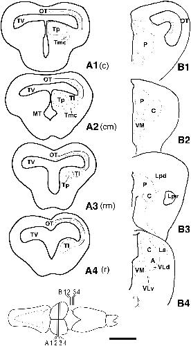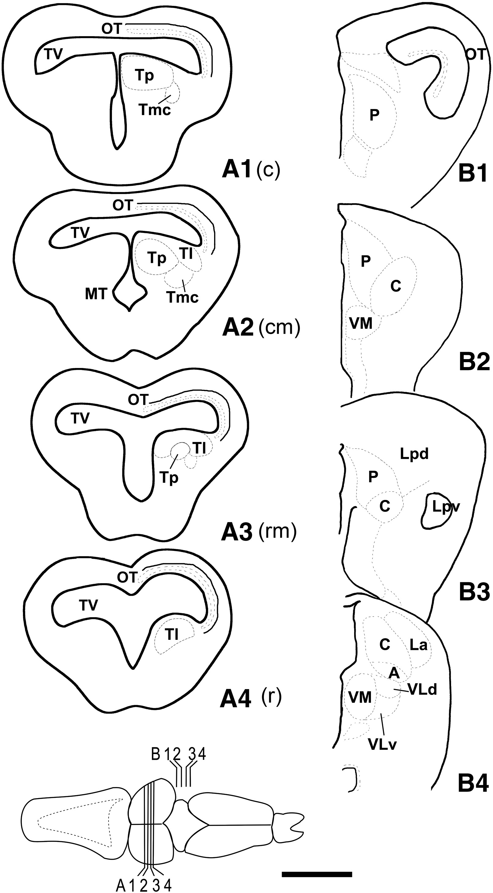 Schematic diagrams of the mesencephalic and diencephalic auditory areas in X. laevis at the end of metamorphosis. The mesencephalic auditory nucleus, consisting of the principal nucleus (Tp), the laminar nucleus (Tl) and the magnocellular nucleus (Tmc), is divided into five equal parts by four coronal planes, A1 (caudal, c), A2 (caudomedial, cm), A3 (rostromedial, rm), and A4 (rostral, r). The diencephalic auditory regions, including the posterior thalamic nucleus (P) and the central thalamic nucleus (C), are divided into five equal parts by four coronal brain planes (B1, B2, B3, and B4). The locations of the above coronal planes in the brain are shown in the insert at the bottom (the rostral is to the right). These planes will be used in the following figures. Dorsal is up. Scale bar = 0.5 mm. For the abbreviations, see list.