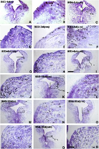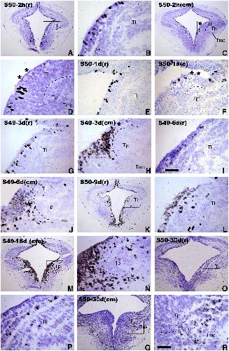 Labeling in torus semicircularis (Ts) after the injections of [3H]-thymidine into tadpoles at S49 or 50. Tadpoles were allowed to survive for 2 h (A and D), 1 d (E and F), 3 d (G and H), 6 d (I and J), 9 d (K and L), 18 d (M and N), or 30 d (O to R). The boxed areas in A, C, K, M, O, and Q are further magnified in the next image. The asterisks in C, D, F, and H show the germinal sites of Tp. The brain levels of the figure located (c: caudal, cm: caudomedial, rm: rostromedial, and r: rostral) are shown in Fig. 1. Scale bar = 200 μm for A, E, G, I, and K and 50 μm for the others. For the abbreviations, see list.