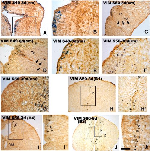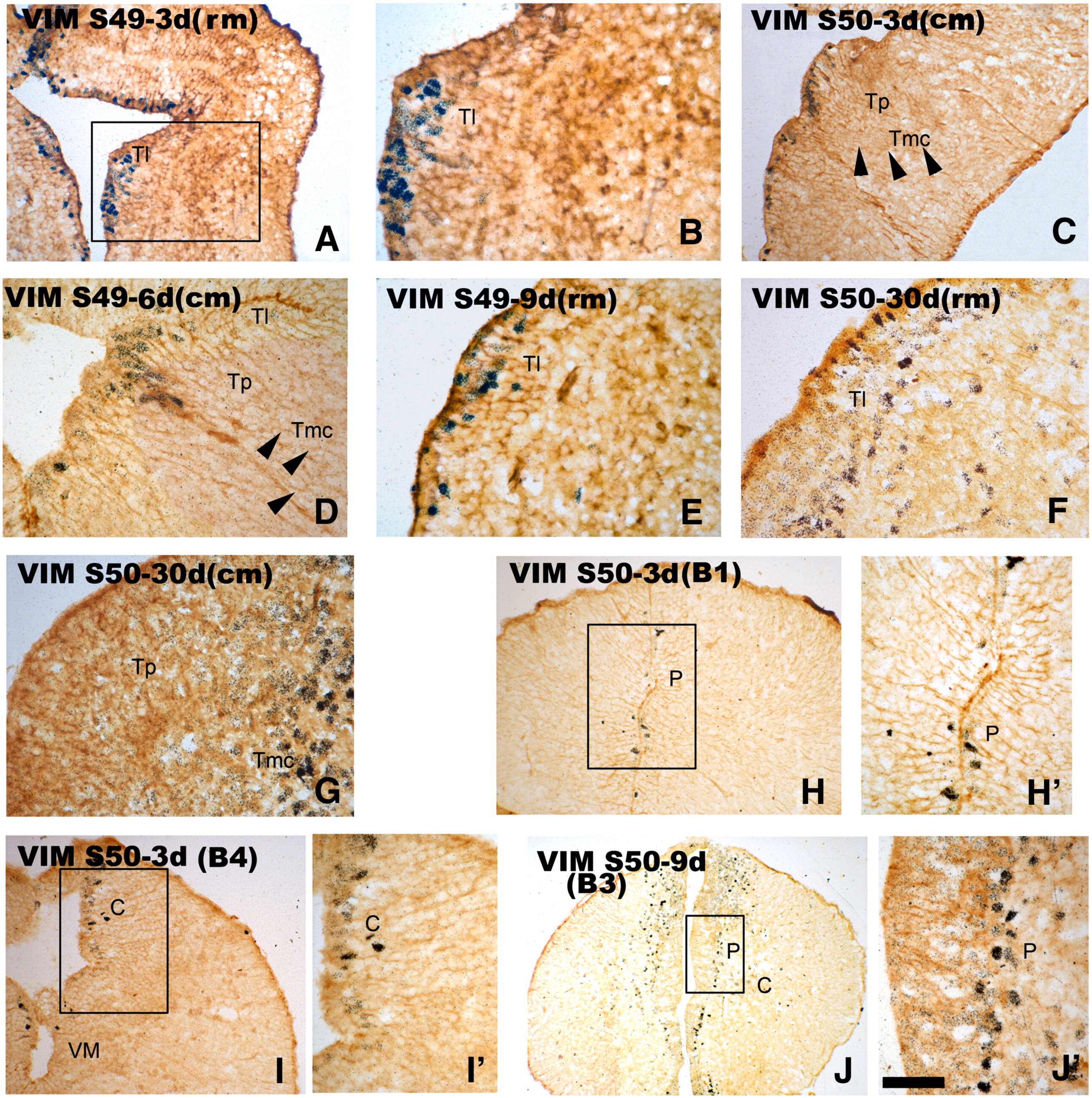 Double labeling for [3H]-thymidine and VIM immunohistochemistry. Tadpoles received [3H]-thymidine injections at S49 (A, B, D, and E) or 50 (C and F to Jâ²). They were allowed to survive for 3 d (A to C and H to Iâ²), 6 d (D), 9 d (E, J, and Jâ²), or 30 d (F and G). The boxed areas in A, H, I, and J are further magnified in the next image. The arrowheads in C and D show the labeled fibers for VIM, which orientate to the magnocellular nucleus (Tmc). The brain levels of the figure located (cm: caudomedial, rm: rostromedial, and B1, B3, or B4) are shown in Fig. 1. Scale bar = 200 μm for J, 100 μm for A, H, and I and 50 μm for the others. For the abbreviations, see list.