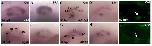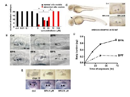 Figure 1. BPA treatment induces otolith abnormalities. A: BPA induced otolith malformation is dose dependent. Embryos were treated with different concentrations of BPA from 5 hpf onwards. Black bars represent embryos showing no otolith abnormalities, red bars represent treated embryos showing otolith abnormalities. (*: P < 0.01, Fisher test after Bonferroni correction). B: Anterior otolith (ao, upper left) and posterior otolith (po, upper middle) of control embryo and ao (lower left) and po (lower middle) of embryos treated with 70 μM BPA from 5 to 50 hpf showing otolith aggregation. In some rare cases a single otolith (upper right) or extra otolith (eo lower right) are observed. C: Upper panel: control embryo at 50 hpf (Upper right: close up of the otic vesicle). Lower panel: overall shape of BPA treated embryos form 6-50 hpf resembles control embryos, but display otolith aggregates (arrow). Lower right: close up of the otic vesicle in a BPA treated embryo form 24-50 hpf showing normal otoliths. D: After 75 hours of exposure, the concentration of BPA measured in embryos is 0.7 μg equivalent per mg fresh weight and 0.22 μg of BPF equivalent per mg fresh weight; see also Figure 2 C-E. E: BPA induces malformation of the otic vesicle in Xenopus embryos. Xenopus embryos were exposed to BPA (5 or 10 μM) from stage NF 18 to stage NF 40 (48 h) and examined at stage NF 45. The upper panel shows the morphology of the otoliths (or otoconia [73]) in control and BPA treated embryos. Note that 5 and 10 μM of BPA induce a progressive reduction in the size of the otoconia. The lower panel shows the semi-circular canals with a reduction in the distance between the two semi circular canals (arrowheads) induced by BPA. Similarly, the morphology of the developing semi circular canals is flattened under BPA treatment. |