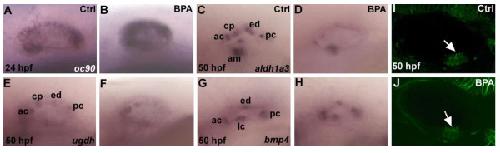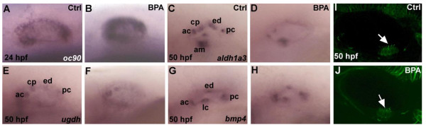 Figure 3. Expression of markers of inner ear development in zebrafish embryos are affected by BPA treatment. (A,B)oc90 a gene require for otolith formation in zebrafish is up-regulated under BPA treatment at 24 hpf (n=30). In situ for control and BPA treated embryos were performed in the same tube with the tip of the tail removed for the control embryos. (C,D)aldh1a3 is detected in the anterior cristae (ac), the cranial epithelial projection (cp), the endolymphatic duct (ed), the posterior cristae (pc) and the anterior macula (am) in wild type zebrafish embryo at 50 hpf (M), its expression is reduced in ac, cp and am and is absent in ed and pc in BPA treated embryos from 6 hpf onward (D). (E,F) Expression of ugdh at 50 hpf in control otic vesicle (E) is detected in the ac, cp, ed and pc. In BPA treated embryos from 6 hpf onwards (D), ugdh expression is severely reduced and remains solely detected in the ac and the cp. (G,H) Expression of bmp4 in control embryos at at 50 hpf (G) in the anterior (ac) lateral (lc) in the posterior cristae (pc) and the endolymphatic duct (ed) remains unaffected after BPA treatment (H). (I,J) Confocal microscopy of acetulated tubulin antibody staining showing the presence of the ciliated macula (white arrow) in control embryos (I) and in BPA treated embryos (white arrow in J). |