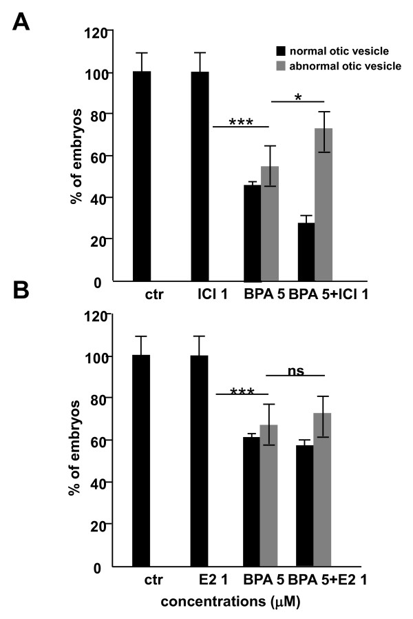 Figure 4. BPA effect on otolith development is estrogen receptor-independent. Morphology of the inner ear of zebrafish embryos at 48 hpf following exposure to BPA with or without ER antagonists (ICI 182 780) or agonists (17-β estradiol, E2). Treatment with either 1 μM ICI (A) or 1 μM 17-β estradiol (B) from 5 to 48 hpf does not induce any malformation of the developing semi-circular canals nor otoliths. Moreover, the BPA-induced otolith phenotype is not rescued when embryos are co-treated with BPA 5 μM +ICI 1 μM (A) or BPA 5 μM +βE2 1 μM (B). Interestingly, co-treatment with BPA 5 μM +ICI 1 μM lead to in increased ratio of affected otolith than a treatment with BPA 5 μM alone (A). On the other hand co-treatment with BPA 5 μM +βE2 1 μM gives a similar ratio than a treatment with BPA 5 μM alone (B). |