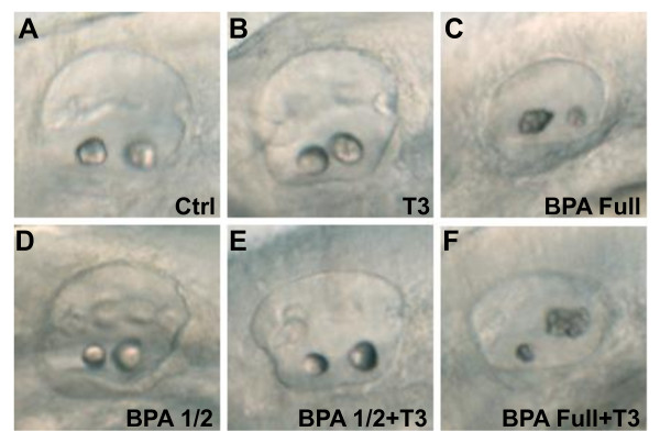 Figure 5. BPA effect on otolith development is thyroid hormones independent. (A) Control otic vesicle at 50 hpf with two otoliths. (B) Treatment with 1 μM of T3, from 5 hpf onwards lead to a normal otolith development. (C) 70 μM BPA treated embryo from 5 hpf onwards lead to otolith aggregates. (D) Half dose of BPA, 35 μM, does not affect otolith development. (E) Co-treatment of half dose of BPA, 35 μM, supplemented with 1 μM of T3 does not affect otolith development. (F) Co-treatment of full dose of BPA, 70 μM supplemented with 1 μM of T3 lead to a similar otolith phenotype than BPA 70 μM alone (compare C with F). |