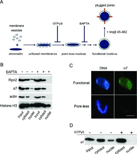 FIGURE 2:. Proteasome targeting requires mature nuclear envelopes and NPCs. (A) Schematic representation of major steps and known chemical inhibitors of the nuclear assembly pathway (reviewed by Harel and Forbes, 2004). The addition of GTPγS at t = 0 of nuclear reconstitution results in unfused membrane vesicles docked on the surface of chromatin. BAPTA inhibits a subsequent step, resulting in aborted assembly intermediates with sealed double nuclear membranes, but no NPCs (poreless nuclei). If nuclear assembly is allowed to proceed normally and recombinant Impβ 45–462 is later added, mature NPCs are formed, but nuclear transport is blocked (plugged pores). (B) Separation of nuclear and cytosolic fractions was carried out as in Figure 1A and compared between normal nuclei (left three columns) and BAPTA-inhibited intermediates (right three columns). Proteasome markers were missing in BAPTA-inhibited nuclear intermediates. (C) Normal (functional) nuclei and BAPTA-inhibited intermediates were immunostained with anti-α7 as in Figure 1B. Scale bar, 10 μm. (D) Separated nuclear and cytosolic fractions were compared between normal assembly and GTPγS-inhibited reactions. The α7 proteasomal marker is absent from the aborted assembly intermediates. |