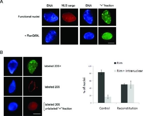 FIGURE 7:. Reconstitution of an import-compatible form of the proteasome. (A) The purified + fraction was fluorescently labeled and tested in an import assay with reconstituted nuclei, as in Figure 6. The labeled + fraction accumulated inside nuclei (right). The addition of RanQ69L-GTP blocked the import of TRITC-NLS-BSA cargo, but did not affect the nuclear accumulation of the + fraction. (B) Preincubation of labeled proteasome particles with cytosol prior to their addition into nuclear reconstitution reactions did not affect their targeting properties. The 20S+ particles were efficiently imported (top row), while 20S particles remained perinuclear (middle row) in the majority of nuclei. By contrast, when labeled 20S particles were preincubated with the unlabeled + fraction, about half of the nuclei exhibited substantial intranuclear accumulation together with nuclear rim staining (bottom row). The histogram on the right compiles the results of three separate experiments, in which individual nuclei were scored as showing either nuclear rim or rim + intranuclear staining. Labeled 20S particles were preincubated with cytosol (control) or with cytosol supplemented with the concentrated + fraction (reconstitution). Error bars represent the SE. Scale bars, 10 μm. |