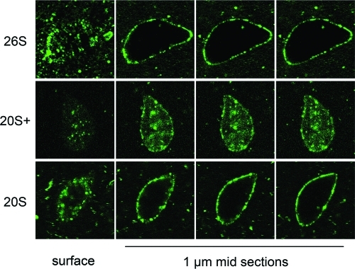 FIGURE 4:. Nuclear targeting and import of fluorescently labeled proteasomes. Purified 26S, 20S+, and 20S particles were fluorescently labeled and added into nuclear reconstitution reactions after the assembly of functional nuclei had been completed. Samples were fixed and analyzed by confocal microscopy. For each of the three particles a representative nucleus is shown, starting with a surface (top) view section on the left, and followed by three consecutive 1-μm-thick confocal sections through the middle of the nucleus. The labeled 26S and 20S particles accumulate at the nuclear envelope, while the 20S+ particle reaches the nucleoplasm. |