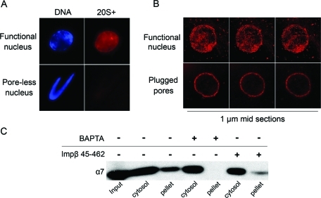 FIGURE 5:. Nuclear targeting of the 20S+ particle requires functional NPCs. (A) Labeled 20S+ particles were added into normal reconstitution reactions (functional nuclei), or reactions in which NPC assembly was inhibited by BAPTA (poreless nuclei). Samples were fixed and analyzed by epifluorescence microscopy; 20S+ staining was not observed in BAPTA-inhibited intermediates. (B) Normal reconstituted reactions were split in two and 8 μM Impβ 45–462 was added to plug the channel of preassembled NPCs in one sample. Labeled 20S+ particles were then added to both samples. Consecutive confocal sections through the middle of representative nuclei are shown. The 20S+ accumulated inside normal nuclei, but only stained the nuclear envelope when pores were plugged. (C) Nuclear and cytosolic fractions were separated and immunoblotted with the α7 proteasomal marker, as in Figure 2. Normal nuclei were compared with BAPTA-inhibited nuclei [corresponding to poreless intermediates in (A)], and Impβ 45–462 was added after assembly [plugged pores in (B)]. The α7 subunit is not detected in the nuclear fraction of BAPTA-inhibited intermediates and a smaller portion of α7 cofractionates with plugged-pore nuclei as compared with normal nuclei. |