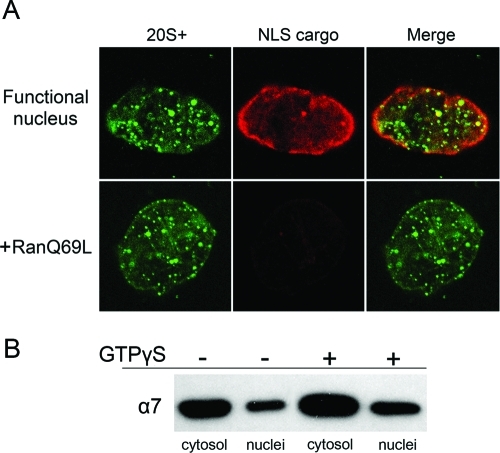 FIGURE 6:. 20S+ import is not blocked by RanGTP. (A) Reconstituted nuclei were preincubated with buffer (control) or 10 μM RanQ69L-GTP for 15 min, before the addition of fluorescently labeled 20S+ particles and TRITC-NLS-BSA import substrate. Both 20S+ and the NLS cargo accumulated in control nuclei (top row; confocal midsection). The import of the NLS cargo was blocked in the presence of RanQ69L-GTP, while 20S+ particles still accumulated inside the nucleus. (B) Nuclear and cytosolic fractions were separated and immunoblotted with anti-α7 as in Figure 5C, comparing normal nuclei with the addition of 2 mM GTPγS after 1 h of assembly. Both reactions were fractionated after 20 min of incubation. The inhibition of GTPase functions after nuclear assembly did not affect the nuclear/cytoplasmic ratio of the α7 proteasomal marker. |
