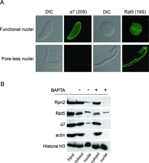 FIGURE 8:. Different 19S subunits show distinct nuclear targeting properties. (A) Normal (functional) nuclei and BAPTA-inhibited (poreless) nuclei were immunostained with anti-α7 and anti-Rpt5 and analyzed by confocal microscopy. Differential interference contrast (DIC) images and confocal midsections are shown for all nuclei. The 20S CP subunit α7 was missing from poreless nuclei, but anti-Rpt5 strongly stained these nuclear assembly intermediates. (B) Nuclear and cytosolic fractions were separated and compared between normal and BAPTA-inhibited nuclei, as in Figure 2B. Immunoblotting of the separate fractions confirmed that Rpt5 was present in the nuclear fraction in both normal and poreless nuclei, while α7 and Rpn2 only associated with normal nuclei. |