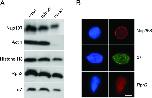 FIGURE 1:. Nuclear targeting of proteasomes. (A) In vitro reconstituted nuclei were separated from the surrounding cytosol by centrifugation through a sucrose cushion, as described in Materials and Methods. Total reaction, cytosolic, and nuclear fractions were immunoblotted with specific markers. Note that actin is exclusively cytosolic, while a fraction of the histone and nucleoporin markers are recruited to nuclei within the time of incubation. The α7 and Rpn2 proteasome subunits are also significantly recruited to the nuclear fraction. (B) Reconstituted nuclei were fixed and processed for indirect immunofluorescence. DNA was stained with Hoechst 33258 (left column). Anti-Nup358 exhibits the typical punctuate rim staining of NPC components. Both α7 and Rpn2 antibodies exhibit punctuate staining throughout the nucleus. Scale bar, 10 μm. |