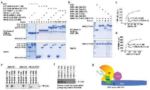 Figure 4. ULD-SDD restricts IKKβ specificity while ULD is required for catalytic activitya, b,Pulldown of hIKKβ constructs using GST-IκBα constructs, showing the reciprocal interaction between ULD-SDD of IKKβ and C-terminal region of IκBα containing ankyrin repeats and PEST region. c, d, Measurement of Km and relative Vmax of IKKβ against full-length IκBα (c) and the N-terminal region of IκBα (1–54) (d). a.u.: arbitrary unit. e, Kinase assay of purified hIKKβ proteins against IκBα, its S32A/S36A mutant (AA), or its PEST-deletion construct (ΔPEST, 1–282) using [γ-32P]ATP. f, Kinase assay of purified hIKKβ proteins using antibody against IκBα phosphorylated at S32 and S36. g, A schematic model showing that the interaction between SDD of IKKβ and C-terminal region of IκBα may position the N-terminal cognate phosphorylation sites of IκBα to the active site of IKKβ.