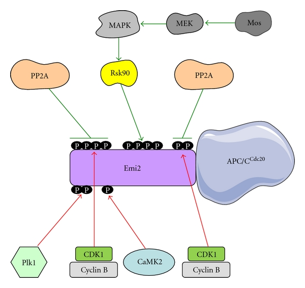 Figure 1. Regulation of Emi2 association with APC/CCdc20. Phosphorylation sites in the upper part of Emi2 are inhibitory for the association and are protected during MII arrest (green arrows and symbols of inhibition), while the sites in the bottom part of Emi2 are activatory for the association and the CSF-arrest exit (red arrows).
