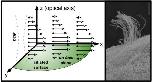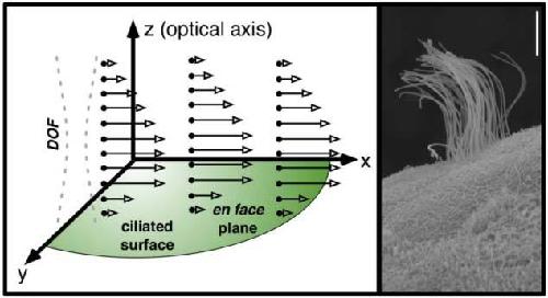 Fig. 1. Left: Idealized cilia-driven flow seeded with tracer particles (black dots). Velocity vectors v(x,y,z) are open-tipped arrows. The ability of OCT to perform depth-resolved imaging along its depth of focus (DOF) enables visualization of flow generated by a ciliated surface that is largely orthogonal to the optical axis. Right: Scanning electron micrograph of a ciliated Xenopus tropicalis epithelial cell. Each multicilated cell is surrounded by several non-ciliated cells. The scale bar is 5 μm.