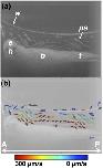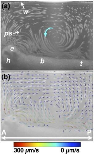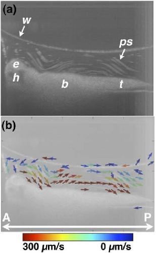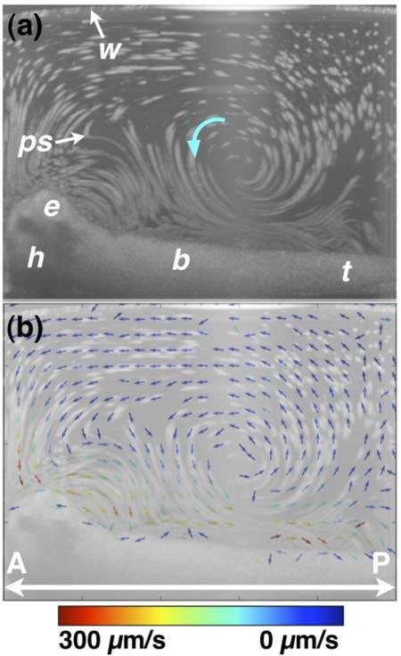 Fig. 7. OCT-based particle tracking velocimetry of non-recirculatory cilia-driven fluid flow. Note that the same embryo was imaged in Figs. 6 and 7 and only the image well water volume differs between the two image acquisition sessions. (a) shows the particle pathline image and (b) shows the two-dimensional, two-component flow velocity field. The vector arrows at the air/water interface in (b) are artifactual b, body; e, eye; h, head; ps, polystyrene microsphere; t, tail; w, air/water interface. A, anterior; P, posterior.
