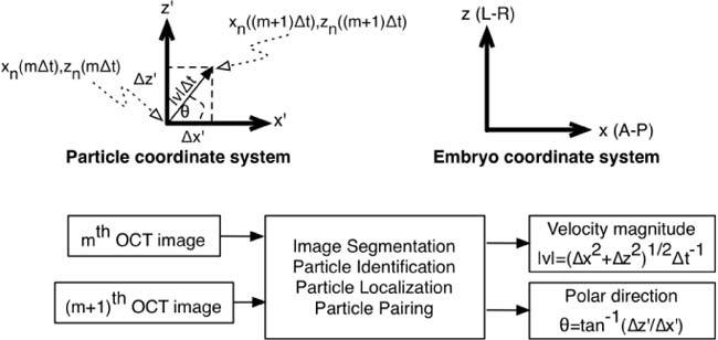 Fig. 3. Top: Particle and embryo coordinate system. Bottom: Overview of image processing for OCT-based particle tracking velocimetry. tan−1 is the four-quadrant arctangent function.