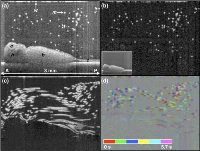 Fig. 4. OCT imaging of X. tropicalis epithelial cilia-driven flow. (a) B-scan of embryo in microparticle-seeded physiologic solution. Original image stack filtered with a 2x2x2 (x,z,t) pixel filter. (b) Background-subtracted B-mode image. The inset in (b) is the minimum projection image across all B-scans over the 5.7 s acquisition. (c) OCT pathline imaging generated by taking the maximum projection over all background-subtracted images over the 5.7 s acquisition. (d) Color-encoding of time pathline imaging. b, body; e, eye; h, head; m, microsphere; t, tail; w, water-air interface. A, anterior; P, posterior. Scale image to have square pixels. Media 1 shows the OCT movie, background-subtracted movie, and related cumulative maximum projection (i.e. cumulative particle pathline) movies.