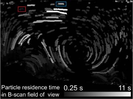 Fig. 8. Particle residence time in B-scan field of view. The embryo has the same position and orientation as in Fig. 6. The grayscale intensity of the streaks encodes the duration in the field of view. The red rectangle marks the particle that was used for the upper plots in Fig. 9, blue marks the particle used for the lower plots in Fig. 9.
