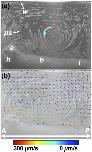 Fig. 6. OCT-based particle tracking velocimetry of recirculatory/vortical cilia-driven fluid flow. Note that the same embryo was imaged in Figs. 6 and 7 and only the image well water volume differs between the two image acquisition sessions. (a) shows the particle pathline image. (b) shows the two-dimensional, two-component (i.e. v = vxi + vzk) flow velocity field superimposed on the particle pathline image. The arrow direction encodes vector direction, while the arrow color encodes vector magnitude. The recirculatory/vortical whorl noted with a blue arrow in (a) has a faster fluid flow closer to the body than further away. Near the surface of the embryo, the flow is largely anterior-to-posterior (i.e. head-to-tail), while “return” flow current is in a posterior-to-anterior direction. b, body; e, eye; h, head; ps, polystyrene microsphere; t, tail; w, air/water interface. A, anterior; P, posterior.
