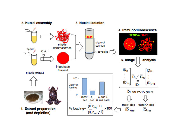 Figure 1. An assay to measure CENP-A incorporation in Xenopus egg extracts. Step 1: Extract preparation and depletion. Extracts are prepared from laid eggs arrested in metaphase II (mitotic extracts) and subjected to immunodepletion with specific antibodies against factor X. Step 2: Nuclei assembly. Sperm chromatin is added to mitotic extracts in two different tubes. In one tube (top), incubation proceeds for 80-120 min to get mitotic chromosomes. In another tube (bottom), calcium is added to drive entry into interphase 40 min after sperm addition. Incubation proceeds for 80 min to get interphase nuclei that have undergone replication. Step 3: Nuclei isolation. Equal volumes of the reaction mixtures in both tubes are combined, fixed and centrifuged over a coverslip placed at the bottom of a glycerol cushion. Step 4: Immunofluorescence. Coverslips are processed for immunofluorescence with an antibody against CENP-A and DNA is stained with DAPI. Step 5: Image acquisition and analysis. Images of a mass of mitotic chromosomes next to an interphase nucleus are acquired and CENP-A signals are quantitated using ImageJ software (http://rsb.info.nih.gov/ij/). The average Integrated Density (ID = average pixel intensity × area) is first calculated from the IDs of individual centromeres within each interphase nucleus (IDI) and neighboring mass of mitotic chromosomes (IDM) and then a ratio between the IDs of each imaged pair is obtained (IDr). Finally, the average ID ratio (IDr) of at least 15 pairs is calculated. The relative CENP-A loading efficiency of a depleted extract with respect to a mock depleted extract (considered 100%) is calculated and represented. If depletion of a factor X prevents loading of CENP-A and the defect is rescued by adding back the factor to the depleted extract, we conclude that factor X is involved in CENP-A incorporation.