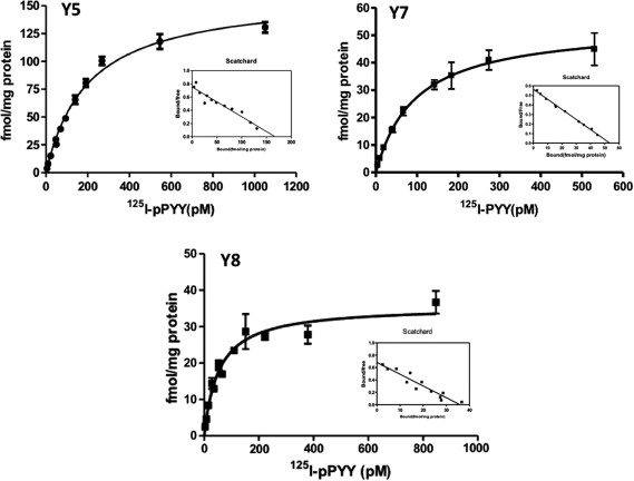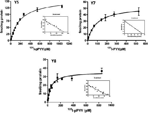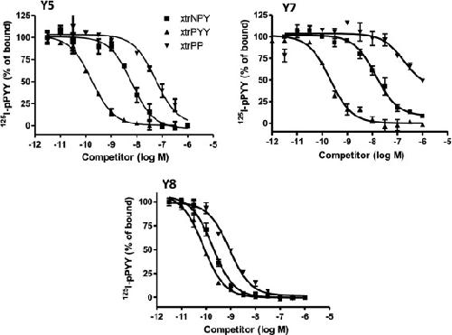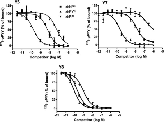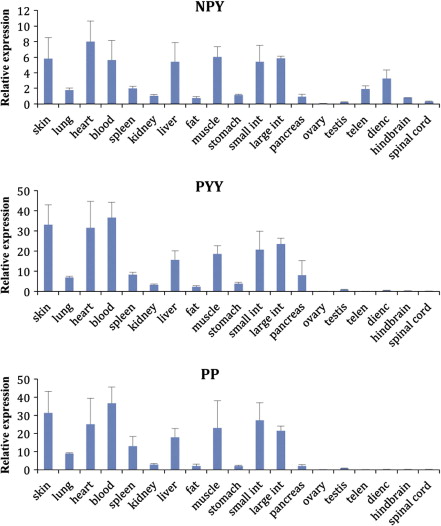 Neuropeptide Y and its related peptides PYY and PP (pancreatic polypeptide) are involved in feeding behavior, regulation of the pituitary and the gastrointestinal tract, and numerous other functions. The peptides act on a family of G-protein coupled receptors with 4-7 members in jawed vertebrates. We describe here the NPY system of the Western clawed frog Silurana (Xenopus) tropicalis. Three peptides, NPY, PYY and PP, were identified together with six receptors, namely subtypes Y1, Y2, Y4, Y5, Y7 and Y8. Thus, this frog has all but one of the ancestral seven gnathostome NPY-family receptors, in contrast to mammals which have lost 2-3 of the receptors. Expression levels of mRNA for the peptide and receptor genes were analyzed in a panel of 19 frog tissues using reverse transcriptase quantitative PCR. The peptide mRNAs had broad distribution with highest expression in skin, blood and small intestine. NPY mRNA was present in the three brain regions investigated, but PYY and PP mRNAs were not detectable in any of these. All receptor mRNAs had similar expression profiles with high expression in skin, blood, muscle and heart. Three of the receptors, Y5, Y7 and Y8, could be functionally expressed in HEK-293 cells and characterized with binding studies using the three frog peptides. PYY had the highest affinity for all three receptors (K(i) 0.042-0.34 nM). Also NPY and PP bound to the Y8 receptor with high affinity (0.14 and 0.50 nM). The low affinity of NPY for the Y5 receptor (100-fold lower than PYY) differs from mammals and chicken. This may suggest a less important role of NPY on Y5 in appetite stimulation in the frog compared with amniotes. In conclusion, our characterization of the NPY system in S. tropicalis with its six receptors demonstrates not only greater complexity than in mammals but also some interesting differences in ligand-receptor preferences.