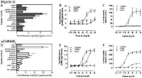 Figure 2. Functional characterization of lfGHRHR and xGHRHR2.Intracellular cAMP accumulation ([cAMP]i) in response to 100 nM of GHRH and related peptides on CHO-K1 cells transfected with (A) lfGHRHR and (D) xGHRHR2 (*** indicates P<0.001, ** indicates P<0.01, and * indicates P<0.05). Effects of GHRH and related peptides on graded concentrations of peptides on [cAMP]i (B) lfGHRHR- and (E) xGHRHR2-expressing cells. The intracellular calcium mobilization ([Ca2+]i) assays of (C) lfGHRHR- and (F) xGHRHR2-expressing cells. For [cAMP]i, values represent mean ± SEM (n = 4). For ([Ca2+]i, data were expressed in ΔRFU value (maximum changes in the fluorescence signals from baseline) and converted to percentage of the maximum of xGHRH-induced [Ca2+]i elevation. Results are expressed as mean ± SEM from at least 10 independent experiments, cell number = 20 to 50. Peptide species: h, human; x, X. laevis, zf, zebrafish D. rerio; gf, goldfish C. auratus.