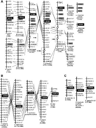 Figure 4. Gene linkage comparisons of GHRHRs in the Osteichthyes lineage.Genes in vicinity of GHRHR were mapped, and syntenic genes were linked by straight lines. Size of the chromosomal region analyzed was given underneath based on the current edition of Ensembl databases. Syntenic genes encoding other secretin GPCR receptors were drawn in grey boxes, and the conserved flanking genes of GHRHR were drawn in closed boxes. (A) Gene environment of GHRHR in the Sarcopterygii lineage represented by human, mouse, lizard, chicken, frog and coelacanth was compared. Despite the syntenic genomic locations of GHRHR and neighbouring genes from human to avians, GHRHR was not located in frog. (B) Gene environment of GHRHR in the Actinopterygii lineage represented by fugu, tetraodon, stickleback, medaka, and zebrafish. Apart from the less conserved genomic region of zebrafish GHRHR, genes in proximity of other teleost GHRHRs were highly syntenic. However, they displayed an entirely different gene environment when compared to the sarcopterygian GHRHRs. (C) Genomic location analysis of xGHRHR characterized in present work and GHRHR2 in zebrafish and chicken. Gene synteny could neither be identified inter-species nor between the two GHRHR genes in the same species. The figures were not drawn to scale.