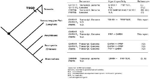 Figure 5. GHRHR, GHRHR2 and PRPR in Osteichthyes lineage.Identified GHRHR, GHRHR2, PRPR and their ligand specificity were summarized in each taxon group. The Sarcopterygii-Actinopterygii split was marked by a black dot (•) and the timing of TSGD (Teleost-specific genome duplication) was indicated [14]. Abbreviations and terminology: Transcript refers to mRNA transcribed; Genome means identified in genome but not isolated; N.A., not available; N.D., not determined (no reported transcript and not found in genome); N.R., No reactivity; *, not endogenous ligand.