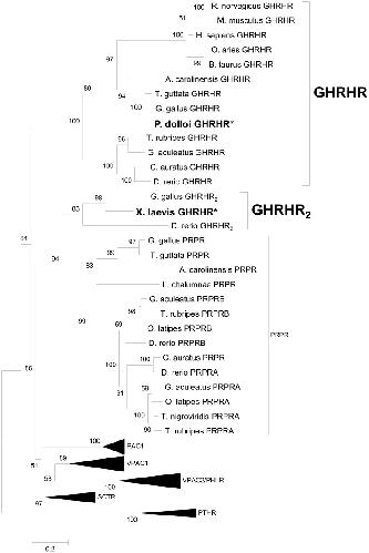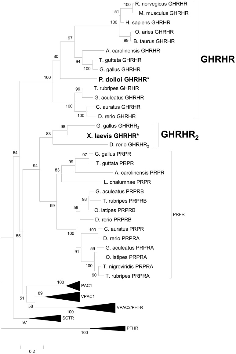 Figure 1. Evolutionary analysis of the osteichthyans secretin GPCR family.The maximum likelihood (ML) optimal tree topology is presented and was constructed with MEGA5. ML bootstrap values higher than 50% are indicated at nodes. To facilitate interpretation, PTHR was used as an outgroup based on the proposed models for secretin GPCR family evolution [7]. The tree supported the identities of lfGHRHR and xGHRHR2 as the orthologs of mammalian GHRHR and chicken GHRHR2 respectively. Accession numbers of the sequences used were listed in Table S2.