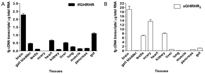 Figure 3. Tissue distribution profile of lfGHRHR and xGHRHR2.Gene expression of (A) lfGHRHR in P. dolloi and (B) xGHRHR2 in X. laevis was assessed by quantitative real-time PCR. The expression level of each gene was calculated from respective standard curve. Data are expressed as mean ± SEM (n = 4). Highest expression for both GHRH receptors was detected in the brain, as observed in mammals.