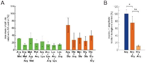 Figure 3. Peptide stimulation evokes calcium transients with lower maximum amplitude than stimulation with amino acids.(A) The maximum amplitude of [Ca2+]i increases upon peptide application (green, group I, 1 mM; orange, group II, 200 µM) is much lower than upon application of amino acids (200 µM; number of responses averaged: L-arginyl-L-methionine (Arg-Met), 2; L-arginyl-L-methionyl-L-arginine (Arg-Met-Arg), 4; L-methionyl-L-arginyl-L-methionine (Met-Arg-Met), 9; L-methionyl-L-arginine (Met-Arg), 9; L-arginyl-L-lysine (Arg-Lys), 4; L-arginyl-L-lysyl-L-arginine (Arg-Lys-Arg), 7; L-lysyl-L-arginyl-L-lysine (Lys-Arg-Lys), 7; L-lysyl-L-arginine (Lys-Arg), 2; out of 12 ORNs, four OE slices; L-arginyl-glycine (Arg-Gly), 10; glycyl-L-arginine (Gly-Arg), 4; L-methionyl-glycine (Met-Gly), 4; glycyl-glycine (Gly-Gly), 4; glycyl-glycyl-glycine (Gly-Gly-Gly), 2; out of six ORNs, four OE slices). (B) Of the five group II peptides only the dipeptide L-arginyl-glycine (Arg-Gly) featured a stimulus-induced maximum amplitude of [Ca2+]i increases comparable to stimulation with L-arginine (only ORNs exclusively sensitive to the amino acid L-arginine, i.e. #27–#30 taken into account). In contrast, the dipeptide glycyl-L-arginine (Gly-Arg) showed a weak response (averaging of multiple applications of glycyl-L-arginine (Gly-Arg); *, p<0.05; **, p<0.001, paired t-test, error bars represent standard deviation). [AA: amino acids, Arg: L-arginine]. |