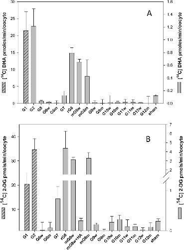 DHA and 2-DG uptake in oocytes injected to express sugar transporters. Xenopus oocytes previously injected with GLUT1, -2, and -5�12 were incubated for 10 min at room temperature with 300 μM [14C]DHA (A) or 1 mM 2-[3H]DG (B). Oocytes were then washed, and intracellular radioactivity was quantified. Control was sham water-injected oocytes. G, facilitative sugar transporter; m, mouse; r, rat; w, wild type GLUT (di-leucine motif); m, mutant GLUT (di-alanine motif); HA, human influenza hemagglutinin. Results are mean � S.D. of 10�20 oocytes.