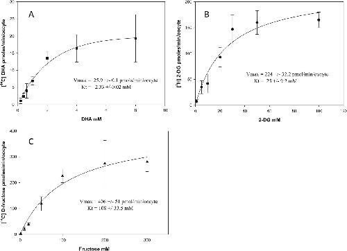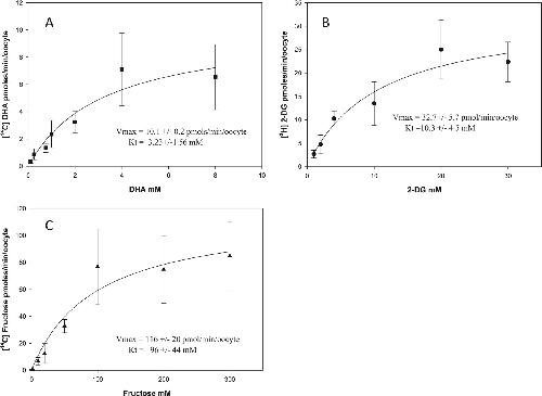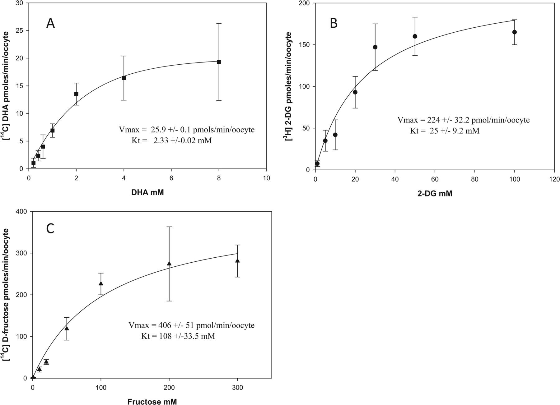DHA, 2-deoxy-D-glucose, and D-fructose transport kinetics in GLUT2-injected oocytes. Oocytes previously injected with GLUT2 mRNA were incubated for 10 min with 0�8 mM [14C]DHA (A), 0�100 mM 2-[3H]DG (B), and 0�300 mM D-[14C]fructose (C). Oocytes were then washed and intracellular radioactivity quantified. A best fit curve was fitted to the collected data using the nonlinear regression function Y = Vmax�X/Kt + X (SigmaPlot). Data represent mean � S.D. of 10�20 oocytes.