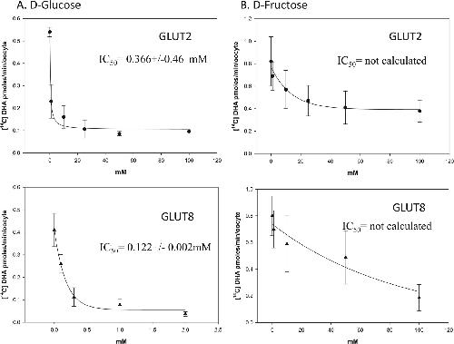 Inhibition of GLUT2- and GLUT8-mediated DHA uptake by sugars. Oocytes injected with GLUT2 (â) and GLUT8 (â´) were incubated with 300 μM [14C]DHA for 10 min in the presence of 0�100 mM D-glucose (A) and 0�100 mM D-fructose (B). Oocytes were washed, and internalized radioactivity was quantified. A best fit curve for the collected data was obtained using nonlinear regression analysis. Data represent mean � S.D. of 10�20 oocytes.