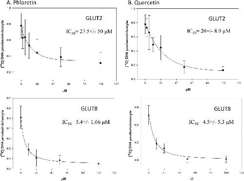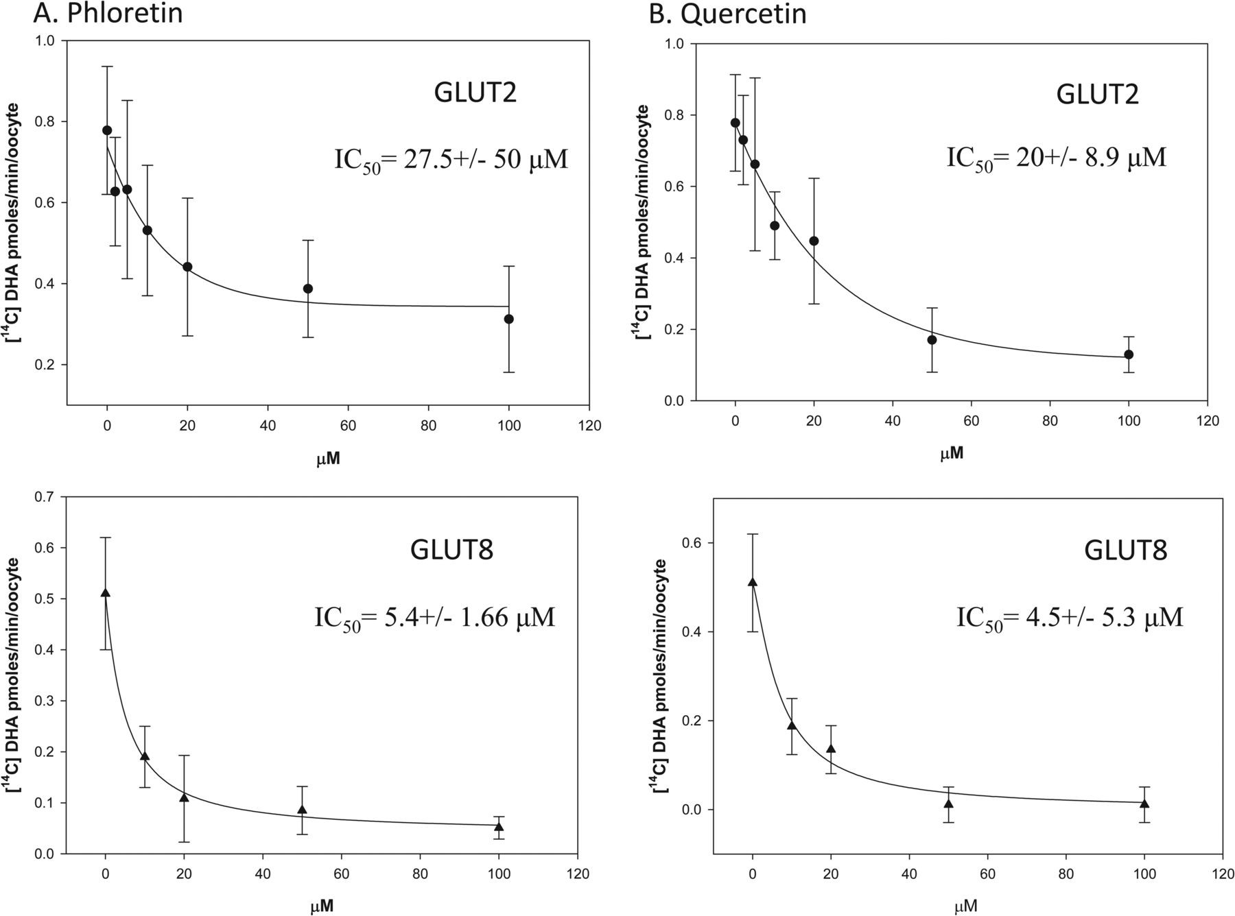 Inhibition of GLUT2- and GLUT8-mediated DHA uptake by flavonoids. Oocytes injected with GLUT2 (â) and GLUT8 (â´) were incubated with 300 μM [14C]DHA for 10 min in the presence of 0�100 μM phloretin (A) and 0�100 μM quercetin (B). Oocytes were washed, and internalized radioactivity was quantified. A best fit curve for the collected data was obtained using nonlinear regression analysis. Data represent mean � S.D. of 10�20 oocytes.
