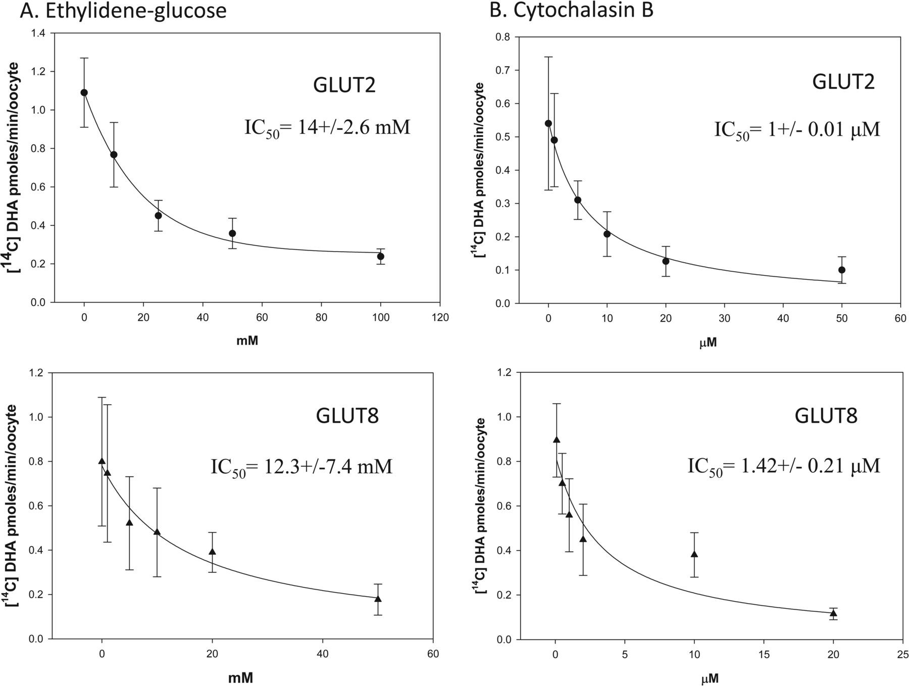 Inhibition of GLUT2- and GLUT8-mediated DHA transport by exo- and endofacial sugar transporter inhibitors. Oocytes injected with GLUT2 (â) and GLUT8 (â´) were incubated with 300 μM [14C]DHA for 10 min in the presence of 0�100 mM of the exofacial sugar transporter inhibitor, ethyldiene glucose (A) and 0�50 μM of the endofacial sugar transporter inhibitor, cytochalasin B (B). Oocytes were washed, and internalized radioactivity was quantified. A best fit curve for the collected data were obtained using the nonlinear regression analysis equation, y = min + (max â min)/1 + (x/IC50) â Hill slope four-parameter logistic curve (SigmaPlot). Data represent mean � S.D. of 10�20 oocytes.