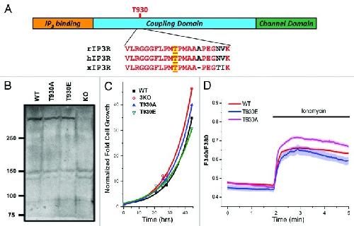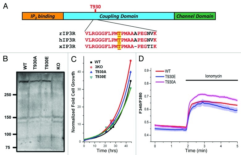 Figure 1. Generation and characterization of stable DT40 cell lines expressing Ins(1,4,5)P3 receptor phosphorylation mutants. (A) Cartoon representation of Ins(1,4,5)P3 receptor structure with sequence alignment around T-930, for the rat (rIP3R), human (hIP3R) and Xenopus (xIP3R) Ins(1,4,5)P3 receptors. (B) Ins(1,4,5)P3R expression levels in the different cell lines. Different cell lines were generated using the DT40 cell line where all three Ins(1,4,5)P3R isoform are deleted (KO). The 3KO cells were electroporated with the linearized plasmid for either the T930A or T930E mutants. The plasmid carrying the mutants contains G418 resistance. Stable cell lines for each mutant were established using G418 selection. WT: DT40 cell line expressing only the wild-type Ins(1,4,5)P3 receptor (type 1); T930A and T930E: expressing the respective mutant Ins(1,4,5)P3Rs. (C) Growth rates of the different cell lines are also equivalent. The same number of cells was plated at time zero and cells were counted at different time points under equivalent culturing conditions to determine whether the expression of the different mutants affects cell growth. Although the T930E mutant grew at a slightly slower rate the difference were not significant. (D) Resting Ca2+ levels and store Ca2+ content were measured in DT40 cells loaded with Fura-2 and incubated in Ca2+-free solution. Ionomycin was added as indicated to release Ca2+ from stores.
