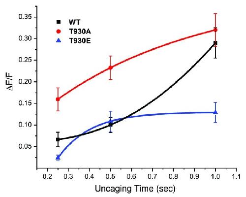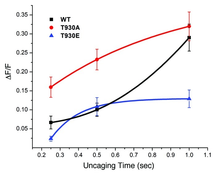 Figure 2. The T930E mutant exhibits decrease Ins(1,4,5)P3-dependent Ca2+ release sensitivity. DT40 cells were loaded with a Ca2+ dye and caged-Ins(1,4,5)P3 and exposed to different UV uncaging pulse durations to produce a dose response of Ins(1,4,5)P3 intracellulary. The level of Ca2+ release following the uncaging pulses was used as a measure of the sensitivity of the Ins(1,4,5)P3 receptor mutants as compared with the wild-type receptor.