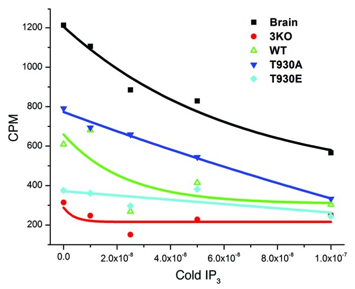 Figure 3. The T930E mutation decreases Ins(1,4,5)P3 binding affinity. Microsomal preparations from brain as a positive control and from the different DT40 cell lines as indicated were subjected to the Ins(1,4,5)P3 binding assay to measure the binding affinity of Ins(1,4,5)P3 receptor mutants. Briefly lysates were allowed to bind radioactively (3H) labeled Ins(1,4,5)P3 and the label competed with cold Ins(1,4,5)P3. The competitive assay provides a relative comparative measure Ins(1,4,5)P3R affinity in the different mutants as compared with the wild type receptor (WT). The negative control was the 3KO cell line which does not express any of the three Ins(1,4,5)P3 receptor isoforms and as such provides non-specific background binding.